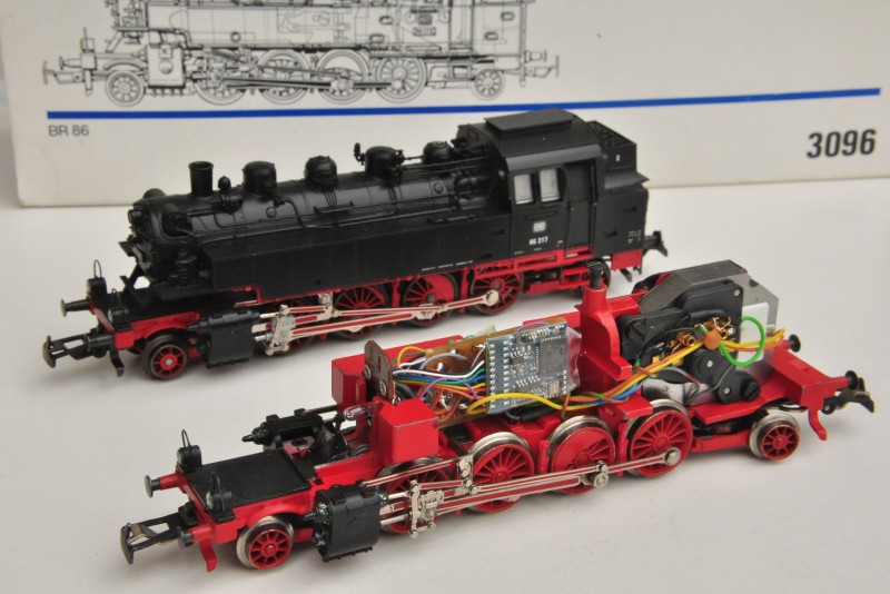 Diese Lok der Baureihe 86 hatte ebenso wie einige weiter unten gezeigte Maschinen bereits einen Decoder ohne Lastregelung. Im Vergleich zu den Lokomotiven mit Hochleistungsantrieb (kurz HLA genannt) machen diese Decoder in Verbindung mit den alten Motoren besonders im unteren Geschwindigkeitsbereich keine Freude mehr. Beim Anfahren und Bremsen und der kleinsten Geschwindigkeit ist man inzwischen besseres gewohnt. Hinzu kommt oft eine flackernde Beleuchtung (wobei man hier nicht dem Decoder die Schuld zuschieben darf) und das Fehlen weiterer technischen Funktionen.