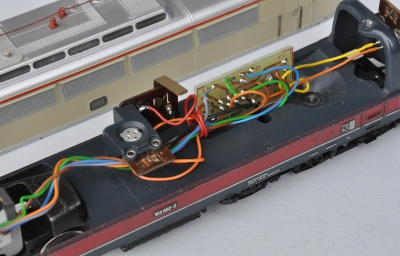 Ein neuer Motor ist montiert, Lampenfassungen sind gesteckt und eine Schnittstellenplatine ist eingebaut. Dann beginnt jetzt die Verkabelung der Lokomotive. Der Motor, alle Funktionen und die Stromzuführungen werden angeschlossen – also mit der Schnittstelle verbunden. Es ist sinnvoll, sich bei der Auswahl der Kabel an ein Farbschema zu halten. Entweder man bevorzugt das DCC oder das Märklin Farbschema. Das ist sicherlich dem persönlichen Geschmack überlassen. Man sollte sich nach der Mehrzahl der Fahrzeuge in seinem Fuhrpark richten, damit man nicht ständig umdenken muss. Bei schwacher Beleuchtung könnte man grau und weiß leicht verwechseln. |