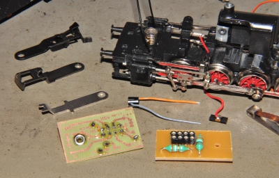 Die Lok wird zunächst getestet, danach demontiert: Ist der Motor verharzt? Dann steht eine genaue Reinigung bevor! Es bringt nichts, wenn man einen neuen Motor in eine verharzte Lok einbaut. Dann werden alle Kupplungsteile und Glühlampen entfernt, schließlich alle Kabel abgelötet. Die Anschlussplatte für den Mittelleiter wird mit einem neuen Kabel versehen, die Telex Spulen werden gesteckt und befestigt. Die Kabel dieser Spulen müssen lang genug sein, um bis zur Verteilerplatine zu führen. Wenn man die Kabel selbst anlötet, müssen die Lötzeiten unter 0,5 Sekunden liegen. Die Kontakte sind winzig und mögen keine Hitze. Die eine Spule ist hier zum Test ohne Kabel eingelegt. |