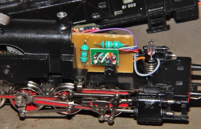 Der neue Motor wird eingebaut, auf leichten Lauf getestet, bevor die Bürsten eingebaut werden. Welche Motoren passen, dafür habe ich auf meinen Seiten auch Informationen gegeben. Dann erfolgt ein Test des Motors mit einem Gleichstromtransformator. Die Stromzuführung kann provisorisch hergestellt werden. Wichtig wäre herauszufinden, wo der Pluspol des Motors für Vorwärtsfahrt ist. Dort wird das grüne Kabel nach Märklin Farbschema angelötet. Gleichzeitig weiß man, dass die Lok fährt und wie sie jetzt fährt. Zwei Drosseln wurden nicht vergessen. Sie sind direkt auf der Schnittstellenplatine angeordnet. Dadurch hat der Lokführer mehr Platz im Führerstand. Außerdem kann man die Bürsten leichter erreichen. In die Lampendrähte kann man leichte Knicke machen, damit der Kontakt verbessert wird und sie fester sitzen. |