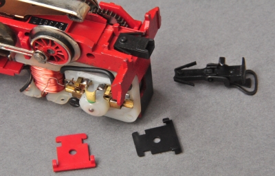 Die vorderen Griffstangen sind sehr zerbrechlich. Für alle Umbauten ist es daher sinnvoll, das Gehäuse abzunehmen. Das vermindert die Gefahr eines Bruchs. Unter einer Abdeckplatte ist die Gehäuseschraube versteckt. Nun wird sichtbar, was in ihr steckt: hier wartet noch manche schöne Beschäftigung, denn die Lok soll einmal digital fahren, die Beleuchtung könnte fahrtrichtungsabhängig und auch rot leuchten... Aber zuerst ist die Kupplung dran. |