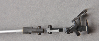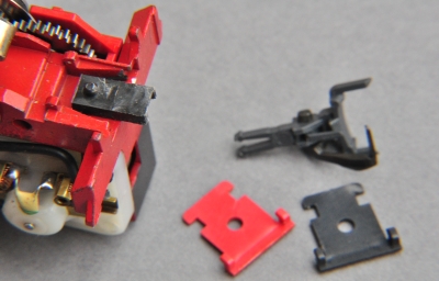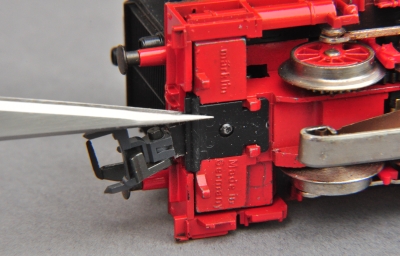 Die erste Hürde besteht bei dieser Lok im Abnehmen der Halteplatte. Dies gelingt auf folgende Weise zerstörungsfrei: Entsprechend der Abbildung greift man mit einer Pinzette bis maximal zur Hälfte der Öffnung hinein, so dass sich die Halteplatte noch biegen lässt. Dann biegt man diese Halteplatte so weit nach unten (also in Richtung „Gleis“), dass sie sich von den Rastverbindungen löst. Das Befestigen nimmt man am besten in der entgegengesetzten Richtung vor: Erst an der Pufferbohle einhängen, dann hinter dem Drehpunkt festdrücken. Falls doch eine Halteplatte dem Kupplungswechsel nicht standhält, findet man hier Ersatz. |