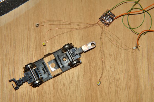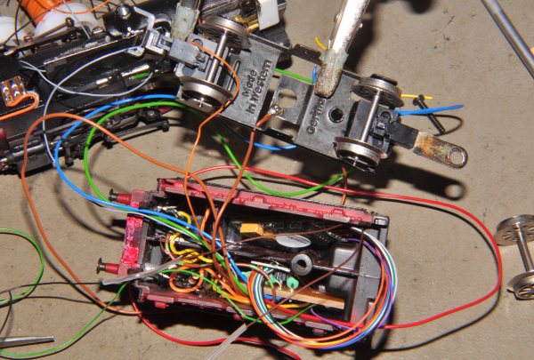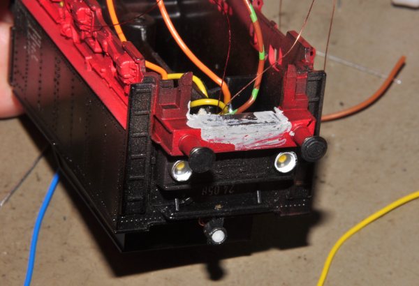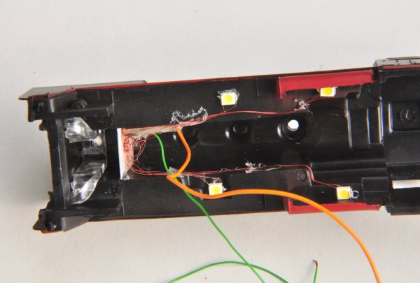 Hier sind diese Arbeiten erledigt. Die LED sind bereits mit Kabeln versehen und zu einer Schaltung geführt, die direkt dahinter angeklemmt ist. Zu sehen sind die Anschlussdrähte der Decoder-Zuleitungen: Versorgung orange, rot an grün-braun und Spitzenlicht gelb für hinten. |