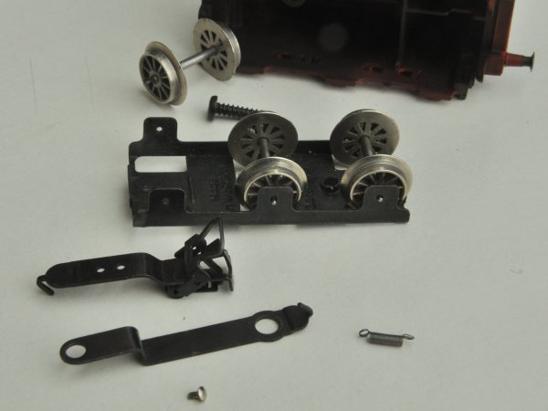 Für den Umbau auf Kurzkupplung wird der Tender zerlegt – mittlere Schraube lösen – und die äußeren Achsen entfernt. Sie sind bei der weiteren Bearbeitung im Weg. Den Wagenboden des Tenders sollte man einebnen. Die alten Deichseln entfallen. |