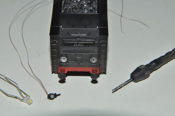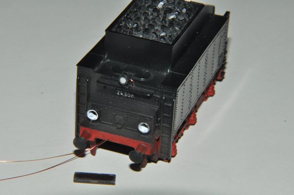 Das Fahrwerk der 24-er wird ebenfalls mit weißen LED beleuchtet. Dazu ist eine Platine im Kessel eingebaut worden. 2 Anschlusskabel führen von dort zum Decoder. |