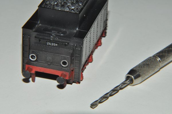 Die Lok hat am Fahrgestell zwar nur einen Drehpunkt, und für den Einbau einer Kulisse müsste sehr viel Material abgetragen werden – was man natürlich scheut – aber vielleicht kommt man bereits mit einer Kulissenführung im Tender weiter. Für die Verbindung liegt hier der Anker 213770 einer Telexkupplung bereit. Er muss etwas bearbeitet werden und wird dann in den Schacht 103 geklebt. Das so umgebaute Modell durchfährt auch R1 anstandslos. |