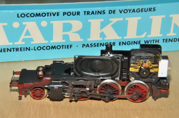 Die Lok benötigt einen kleinen Scheibenkollektormotor 60943. Am Motorschild ist links eine Senkschraube 756080 zu sehen. Sie ist notwendig, weil sonst der Spurkranz den Schraubenkopf berühren würde. An der Position des alten Fahrtrichtungsschalters passt perfekt der Lautsprecher. Er ist kein normales Märklin- oder ESU-Produkt. Ich habe lange nach bassstarken Lautsprechern gesucht… und das Ergebnis ist nun wirklich besser. Auf die Wiedergabe tiefer Töne sollte man bei Soundumbauten achten. Hohe Töne sind eher unangenehm und erzeugen keinen wirklichen Hörgenuss. |