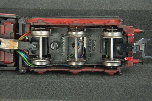 Hier sind alle Kabel im Tender integriert. Der Kabelweg wurde hier begonnen, dann zur Lok weitergeführt und dort gekürzt. 9 Kabel müssten es sein… Die exakten Einbaupositionen der Kulissen 111 sind noch einmal gut sichtbar. Der Anker der Telexkupplung wurde brüniert. Der Abstand zwischen Lok und Tender ist sehr kurz. Die Lok durchfährt aber R1 auch anstandslos. (Könnte mancher ja auf der Anlage haben...) Wenn der Mittelschleifer ersetzt werden muss, nehme man 7173. Siehe unten. |