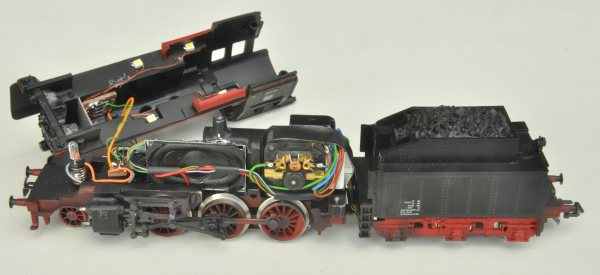 Die Lok soll natürlich einen aktuellen Antrieb erhalten und auch mit Sound ausgestattet werden. Der Lautsprecher soll möglichst in der Lok montiert werden, weil bei der echten Lok das Geräusch ja auch hauptsächlich vom Triebwerk/Zylinderbereich der Lok kommt. Daher hat der Decoder vorne keinen Platz mehr. Also muss für alles im Tender Platz vorhanden sein. Außerdem wird es viele Kabel geben, die vom Tender zur Lok führen. Ob wohl noch Ordnung ins Chaos kommt?