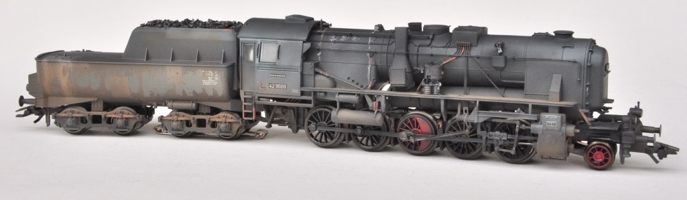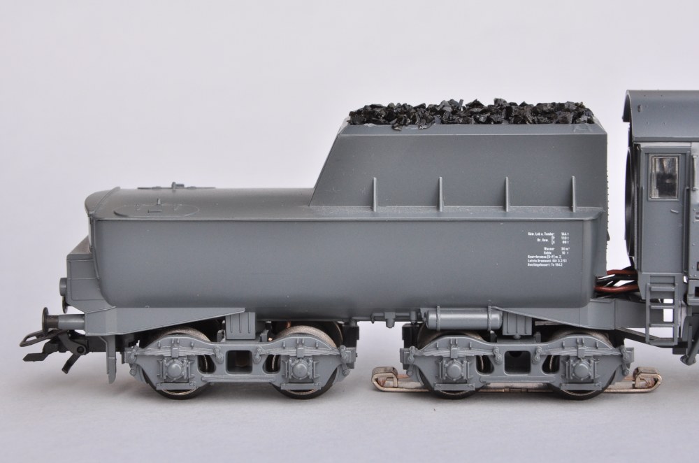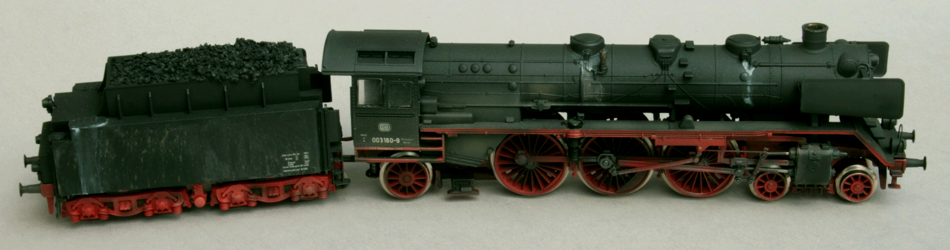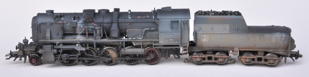 Hier noch ein Bild der Märklin 42 9000 von der anderen Seite. Weil der Schlot dieser Lok nicht vorne, sondern etwa in der Mitte angeordnet ist, stellen sich auch die Verschmutzungen durch Ruß anders dar. Die unterschiedlich ausgeführten Farbflicken am Tender sind im Vergleichsbild deutlich unterschiedlich. Zu DB-Zeiten war es üblich, nur an den notwendigen Stellen zu lackieren.