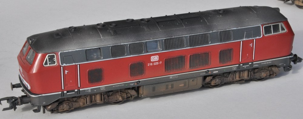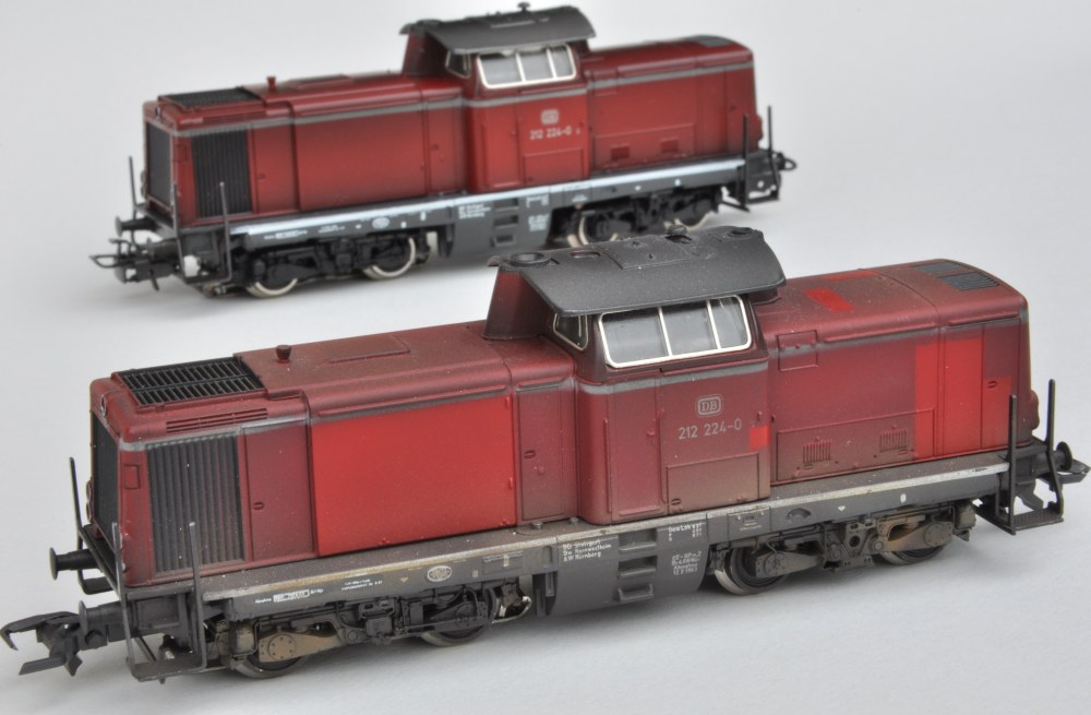 Dieselloks sind ein nicht weniger lohnendes Arbeitsfeld in der Alterung. Denn auch bei diesen Modellen lassen sich vielfach noch optische Details verbessern. Die hier abgebildete BR 212 stammt aus der Märklin Zugpackung Mineralölzug mit zweiachsigen Eva-Kesselwagen. Im Hintergrund ein unbearbeitetes Modell. Wie so oft bei ab Werk gealterten Modellen, entspricht der Zustand nicht unbedingt dem Outfit, wie diese in der Wirklichkeit anzutreffen waren. Durch eine Mattierung des Gehäuses, einige zusätzliche Farbflicken und der Alterung im Bereich des Fahrgestells entstand ein wirklich geändertes Erscheinungsbild. Und natürlich hat das Modell jetzt eine Kurzkupplung.