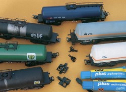 Alte Modelle kurz gekuppelt, Folge 6 im MM 3.2003, Seite 48 - Download Vierachsige Gas- und Mineralöl-Kesselwagen mit Metallkupplung werden mit der Roco-Kulisse 40344 optimiert. Die angegebenen Tauschteile sind nicht mehr bei Märklin verfügbar. Distanzplatte für Mineralölkesselwagen: 0,5mm. Puffertausch möglich mit Märklin Puffern 494780. Bei Gaskesselwagen beachten, ob Wagenboden verzogen ist! Dann sind Distanzplatten und ggf. Fräsen erforderlich. |
