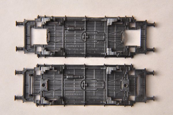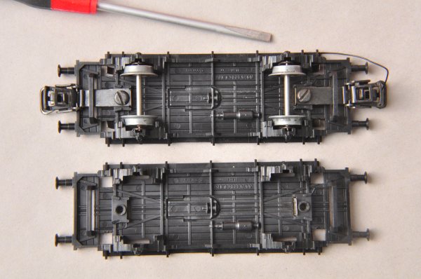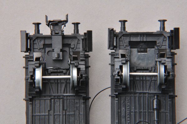 Der Wagen kann anschließend wieder montiert werden. Das Gehäuse und Inneneinrichtung werden später montiert. An diesen Teilen werden noch Veränderungen durchgeführt. Zum Einbau der Kulissen ist zunächst nur der Wagenboden fertig zusammenzubauen. Hier sieht man nach dem Einbau auch den Unterschied im Kuppelabstand. Es sind derzeit Standardkupplungen montiert, die später durch stromführende von RTS ersetzt werden. Da jeder Wagen über beide Radsätze Masse abgibt, genügt eine einpolige stromführende Kupplung zur Versorgung mit Fahrstrom für die Beleuchtung. |
