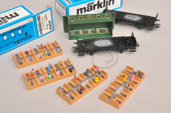 Es folgt nun der Umbau auf Beleuchtung. Die Fenster werden ausgebaut, damit der innere Bereich gefärbt werden kann. Innenwände haben bei Personenwagen des Vorbilds eine andere Farbe als außen. Dies wurde im Modell ebenfalls dargestellt. Die Wände wurden mit hellerer Farbe lackiert. Der Fußboden der Inneneinrichtung wurde in grau lackiert, bevor die Figuren eingeklebt wurden. |