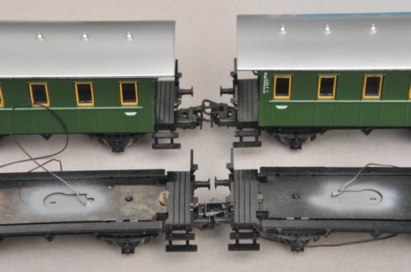 Die Wagen haben eine Relexkupplung aus Metall, die mit einem sehr weiten Abstand kuppelt. Der Umbau auf Kulissenführung lohnt sich allein bereits deshalb. Außerdem soll eine stromführende Kupplung eingebaut werden, damit der gesamte Zug nur einen Schleifer bekommt. Alternativ wäre natürlich auch eine Versorgung von der Lok aus möglich. |