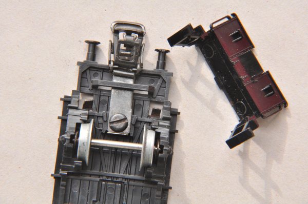 Zum Umbau muss dieses Modell geöffnet und zerlegt werden. Bereits das Abnehmen des Gehäuses ist mit einer Besonderheit versehen, wie es sonst bei Märklin nicht üblich ist.