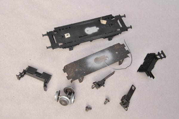 Dann kann der Wagenboden weiter zerlegt werden. Jetzt haben wir den kompletten Wagen in Einzelteilen vor uns. Der Umbau auf Kurzkupplung kann nun beginnen. Dazu benutzen wir für jeden Wagen 1 Paar SYMOBA Kulissen 111 mit einem Paar Schächten 103. |