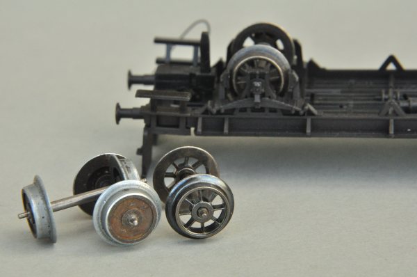 Nach abgeschlossenem Umbau auf Kurzkupplung wollte ich neue Achsen einbauen. Die Lager sind sehr filigran gestaltet. Der Einbau von Speichenradsätzen bietet sich an. Das wertet die Wagen enorm auf.