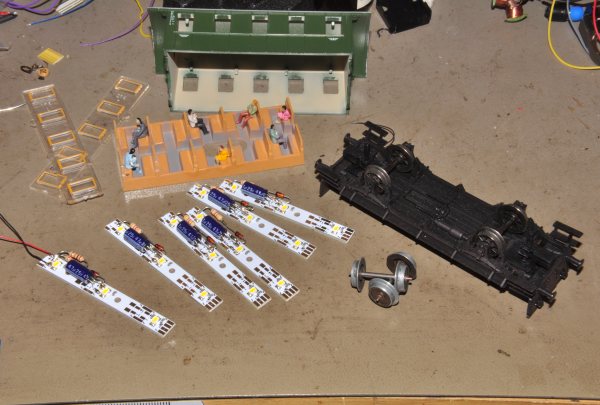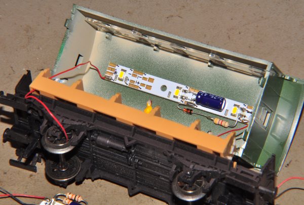 Die Innenbeleuchtungen stammen aus Abschnitten einer digitalen Beleuchtung. Sie wurden noch mit einigen Bauteilen ergänzt. Es handelt sich um Abschnitte von ESU-Beleuchtungen. Artikelnummer 50700 oder 50708 |