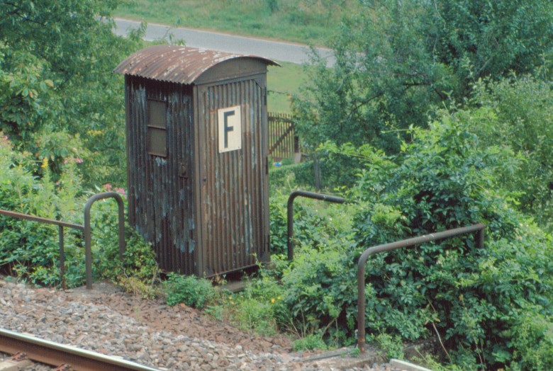 Diese Wellblechbude hat einmal schöner ausgesehen. Schöner? Was schön ist, das ist doch geschmackssache, oder? In jedem Fall war noch ein funktionstüchtiger Fernsprecher eingebaut. Denn Kommunikation ist wichtig bei der Bahn. Steht die Hütte immer noch an der linken Rheinstrecke?