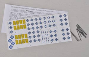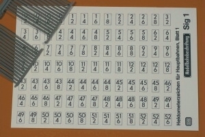 Weinert-7303 Signaltafeln für Haupt- und Nebenbahnen DB und DRG. Unter anderem 8+2 Bakensätze für Vorsignale, Schachbrett- und Haltetafeln. 2 identische Bögen pro Packung. Mit Aufstellhinweisen und Lageplänen. Verpackungsinhalt: |