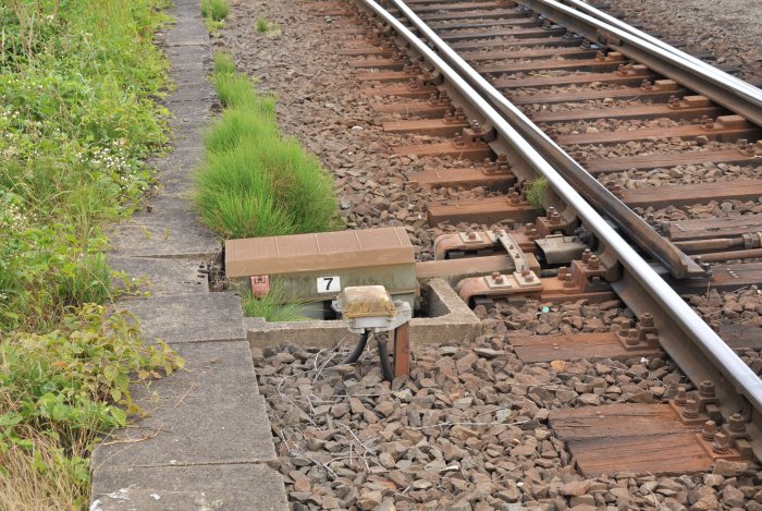 Auch beim Vorbild wird es manchmal eng: Hier ein breiter Kabelschacht neben einem Weichenantrieb mit Gleisanschlussgehäuse. Es handelt sich um ein Nebengleis am Rand eines Bahnhofes.