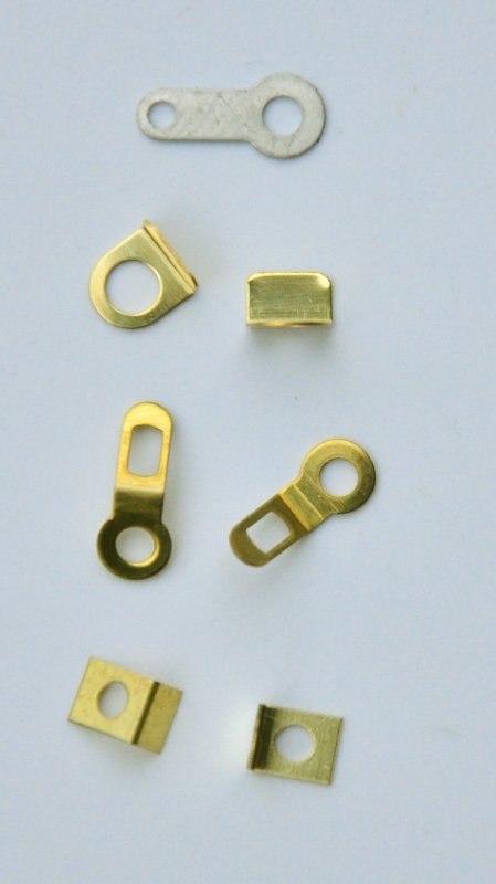 Lötfahnen für gute Masseverbindung - großes Bild -Lötfahne vernickelt, gerade. Artikelnummer 12. Kein Märklin-Teil, aber günstig; Preis pro Stück 0,35€ -Märklin E212230 Lötfahne für großen Scheibenkollektormotor, Verkauf nur in der VE mit 20 Stück: 5,40 € -Märklin E703510 Lötfahne Messing rund, ca. 45° abgewinkelt. -Märklin E231470 Lötfahne Messing eckig, 90° abgewinkelt, für Motorschild des kleinen Scheibenkollektormotors und des Trommelkollektormotors. |