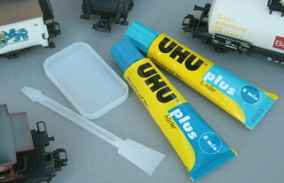Zweikomponentenklebstoff hat den großen Vorteil, vor der endgültigen Aushärtung rückstandsfrei entfernt werden zu können. Es passiert selbst dem geübten Bastler, die Position der Kulisse noch einmal korrigieren zu müssen. Nutzt man dagegen andere Klebstoffe, die sich nicht entfernen lassen, wird die Kulisse beim Entfernen beschädigt.