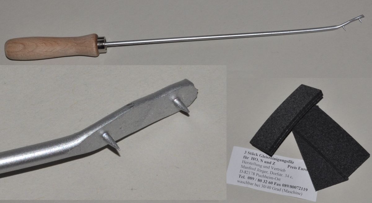 Die schonende Gleisreinigung mit Filzen ist für jeden Modellbahner eine echte Arbeitserleichterung. Einen Jörger Reinigungswagen findet man derzeit nur im Märklin Programm. Er sollte permanent mitlaufen. Dadurch entsteht ein besonders glattes Schienenprofil, auf dem sich der Schmutz nicht mehr so leicht festsetzen kann. Aber das allein genügt nicht. Denn auch die Flanken (Innenseiten der Gleisprofile) tragen besonders zu einem guten Kontakt bei. Deshalb müssen sie gelegentlich gereinigt werden, weil viele Achsen besonders hier auf guten Kontakt Wert legen! Ein Reinigungswagen kann an den Flanken nicht reinigen. Das wird leider oft übersehen. Der Handreiniger gehört daher unbedingt ebenfalls zur Ausstattung! Bei der Handreinigung kann es sinnvoll sein, die Filze mit einer Reinigungsflüssigkeit zu tränken. So lässt sich auch hartnäckiger Schmutz leicht entfernen.